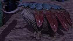 This strange beast moves in great bounds, afloat on its red and blue, gas-gilled body. It is known to be quite harmless, but will eject acid fluid through its trunk-like proboscis when aggravated.
